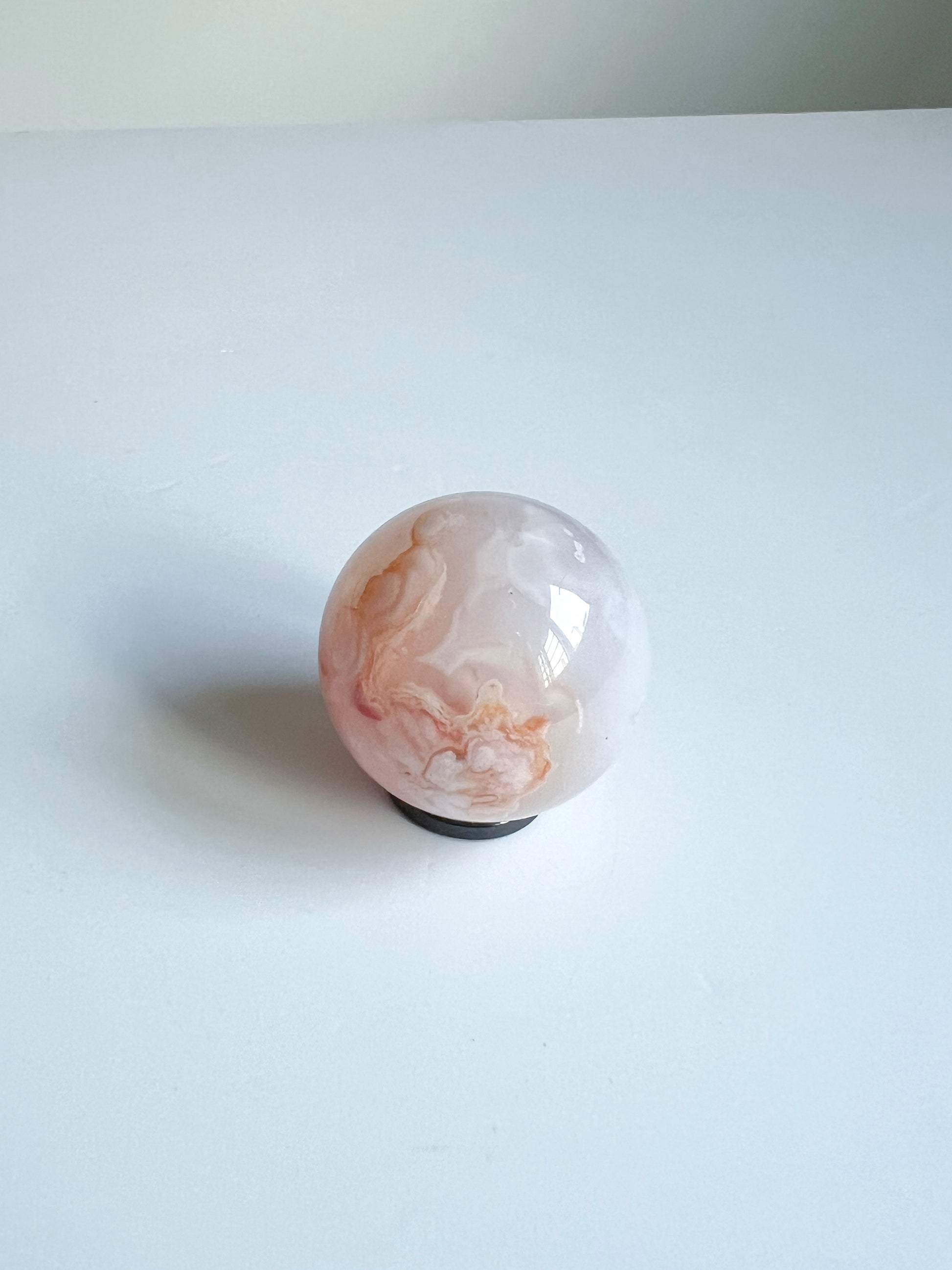 A soft-glowing Carnelian Flower Agate sphere with a bold, cloud-like bloom at its heart — grounding, nurturing, and blooming with quiet strength.