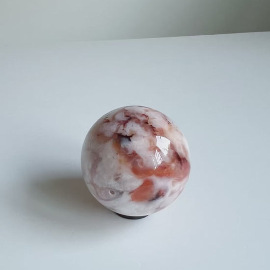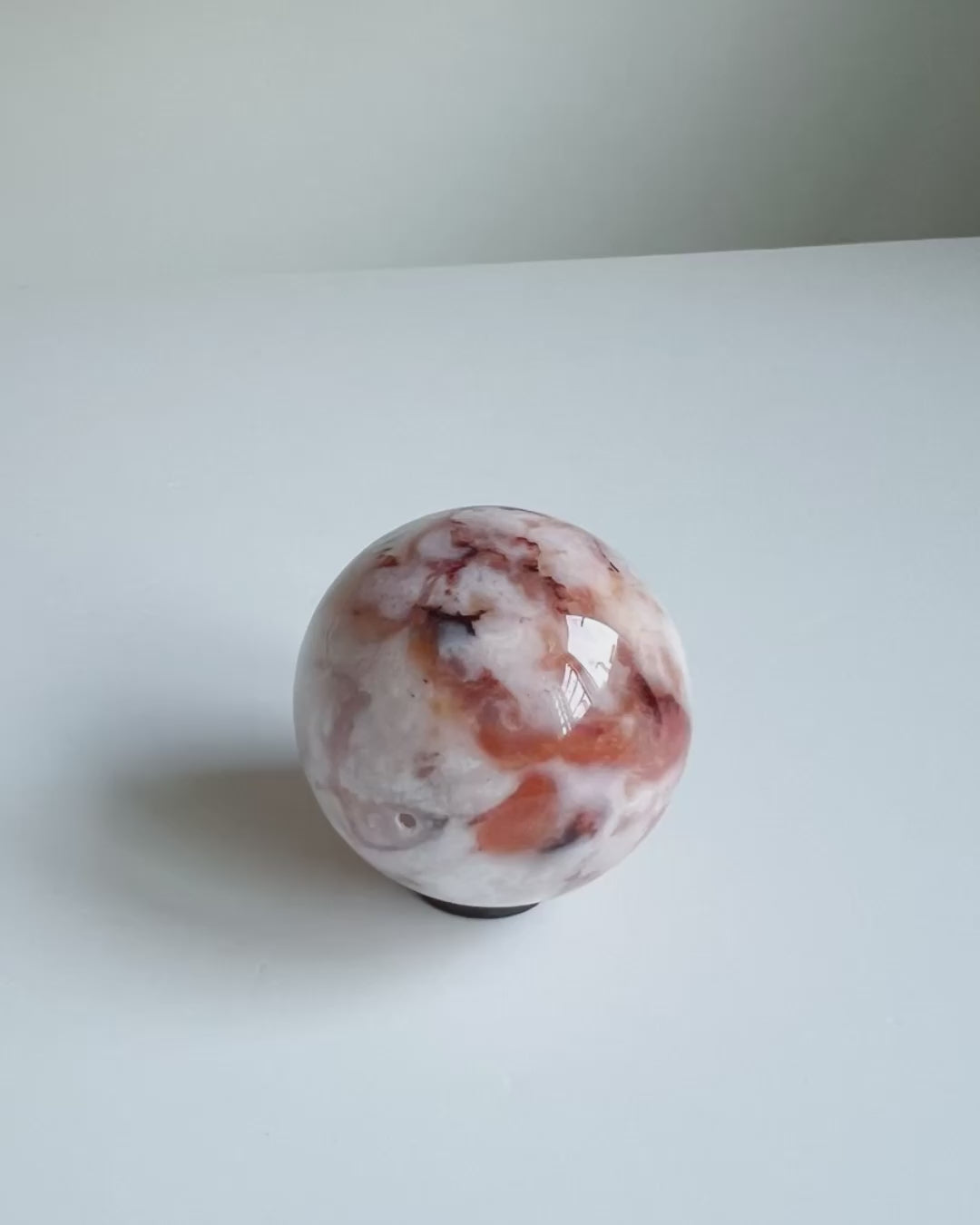 A rich Carnelian Flower Agate sphere with deep russet blooms, hidden heart and soft cream clouds — bold, textural, and full of elemental warmth.