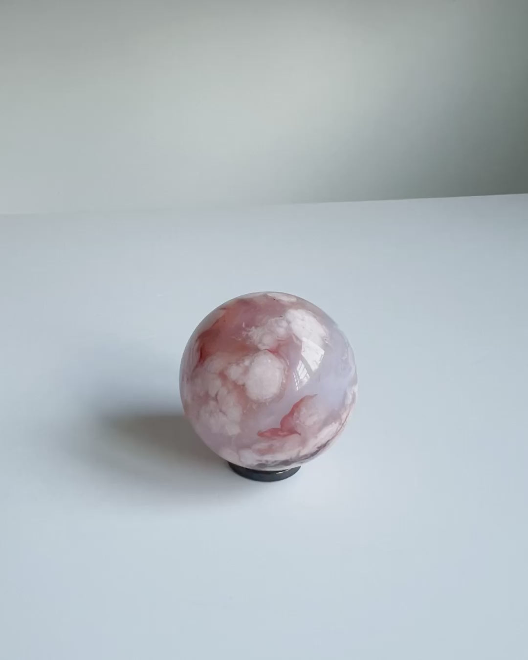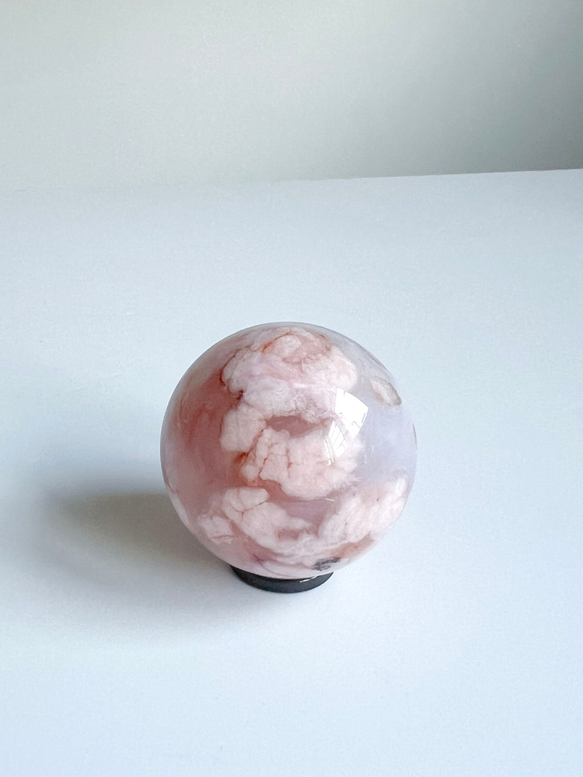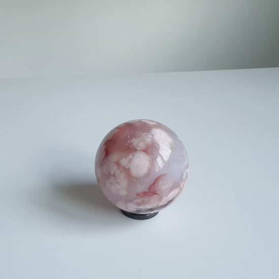 Phoenix: A misty Carnelian Flower Agate sphere adorned with soft blue hues and blooming coral petals — where a phoenix in flight dances across a sky of calm and wonder.