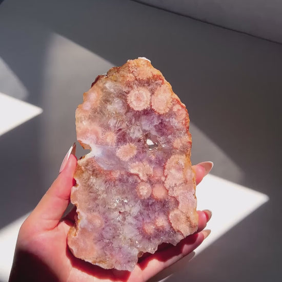 A crowd favourite, Lily is a joyful Flower Agate slab with amazing colors: lilac, pink, peach and red tones, adorned with intricate blooming plumes and sugary quartz sparkle. A tiny splash of light blue agate adds a playful, fairy-like charm to this beautiful piece.
